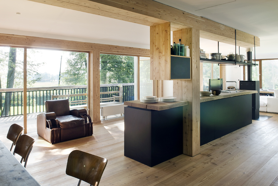 Ein Holzdeck bildet nun die Wohnbereiche, durch die Erweiterung in eine großzügige Balkon-Loggia scheint es wie ein Baumhaus im alten Baumbestand zu schweben. Alles bleibt einfach, heiter und selbstverständlich.