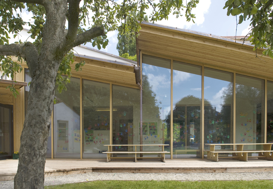 Den 1981 gebauten Schondorfer Kindergarten galt es, innerhalb des bestehenden Konzeptes um das Doppelte zu erweitern und zu ergänzen. Grundidee dabei war, einen gemeinsamen Bezugspunkt aller Gruppenräume sowohl im Innen- als auch im Außenbereich zu schaffen und den Kindern Räume für die eigene „Dorfgemeinschaft“ zu schenken.