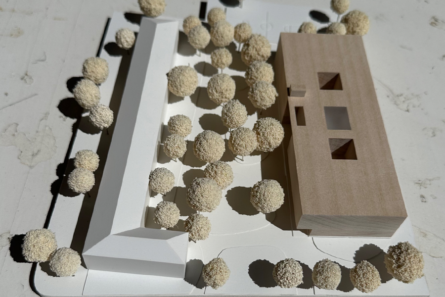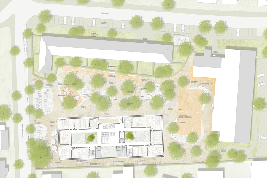 Durch das Abrücken von der westlichen Grundstücksgrenze kann der Baumbestand erhalten bleiben, der einen weiteren qualitätvollen Außenraum als Auftakt zu Schulhaus und Pausenhof darstellt.