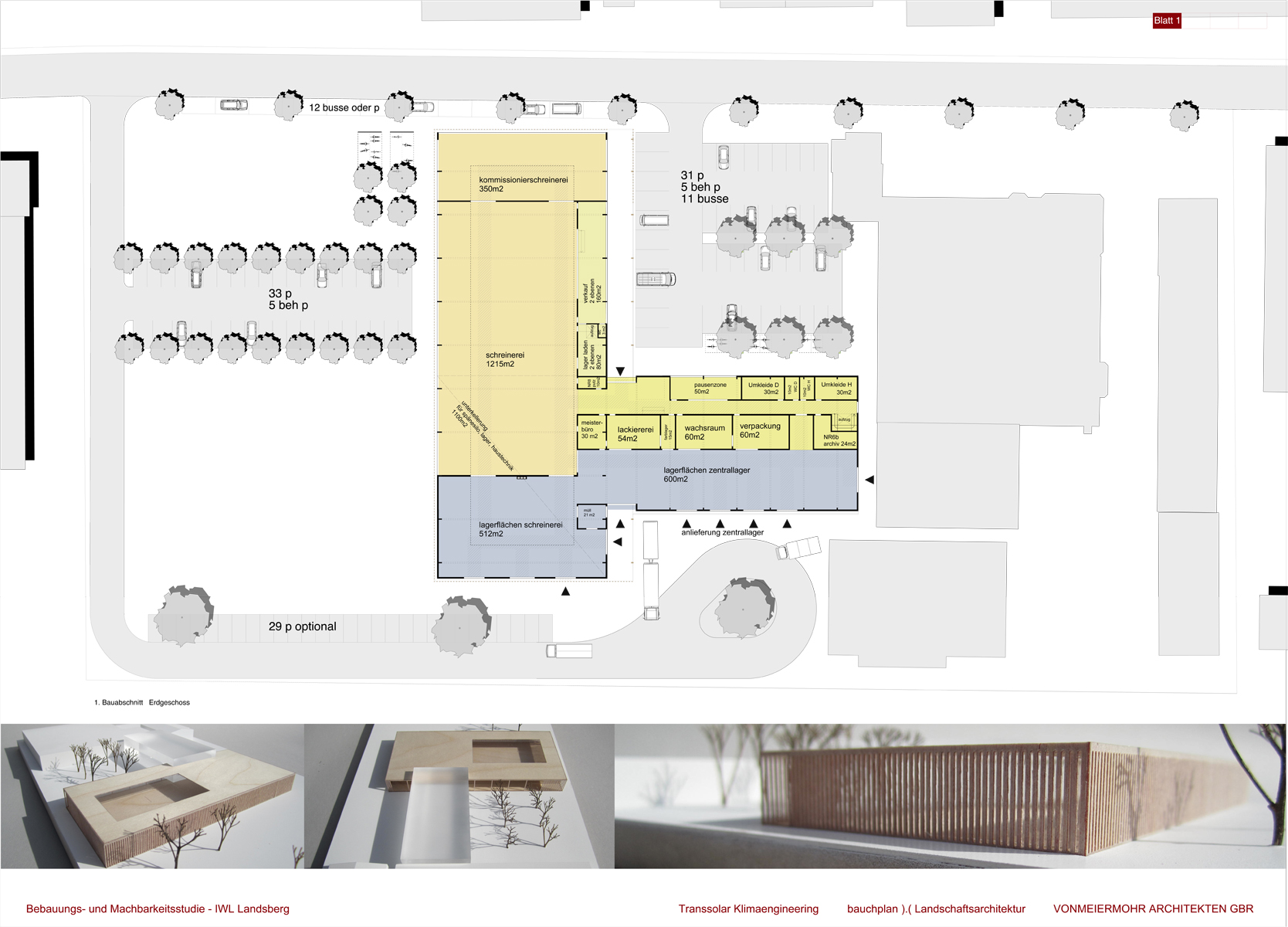 Für den weiträumigen Ausbau der Werkstätten und Wohnräume der Beschäftigten wurde zu dem Gebiet der Hauptverwaltung der IWL in Landsberg/Lech ein großes Areal zugekauft. VonMeierMohr Architekten wurden neben 5 weiteren Architekturbüros zu einem gutachterlichen Wettbewerb (IWL Bebauungs-und Machbarkeitsstudie ) geladen.